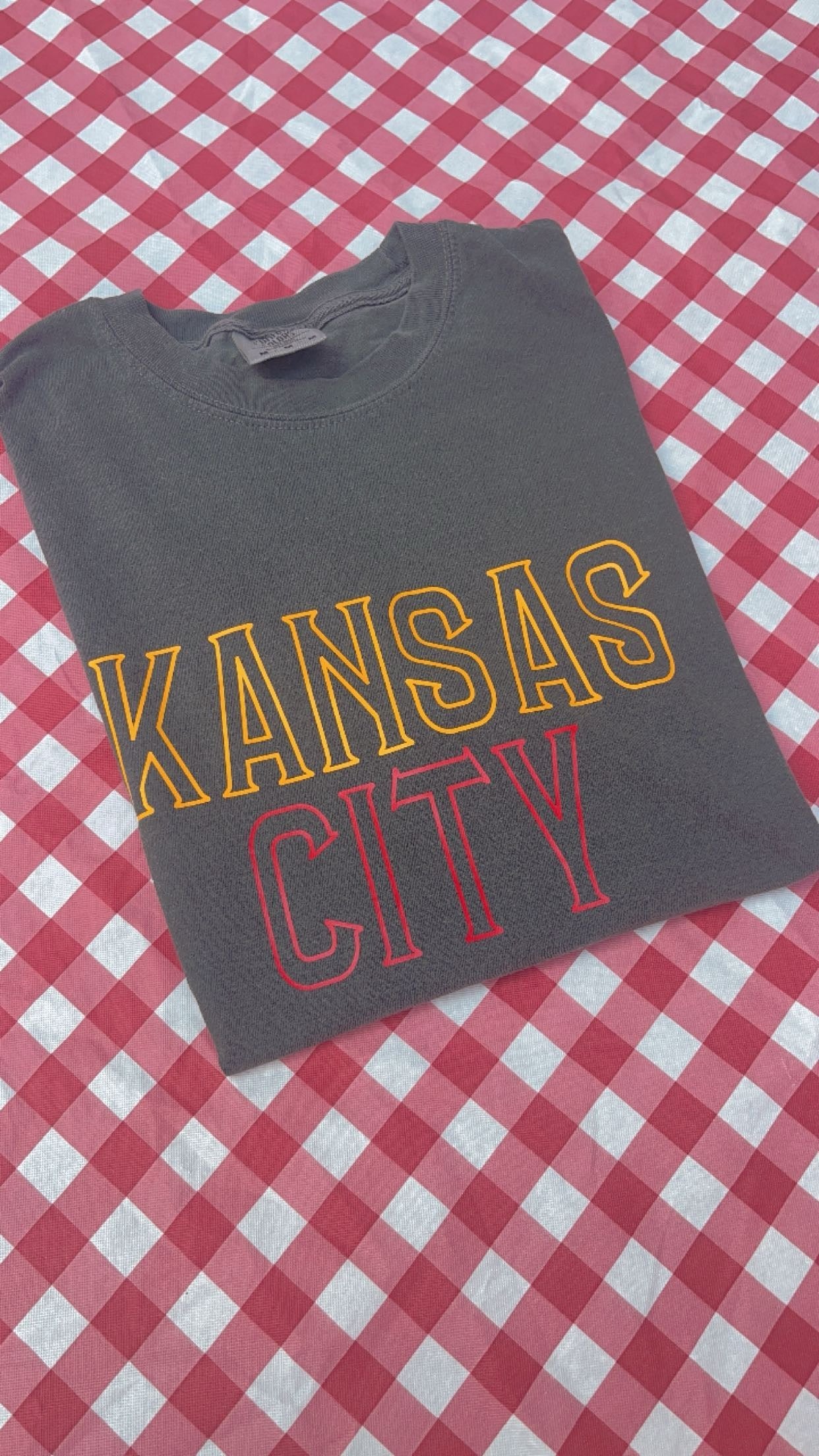 Pre-shrunk 100% Cotton Adult Unisex Tee in Pepper- the perfect heathered black vintage look. "Kansas City" screen printed across chest in red and yellow. True to size fit. Size up 1-2 sizes for an oversized fit.
